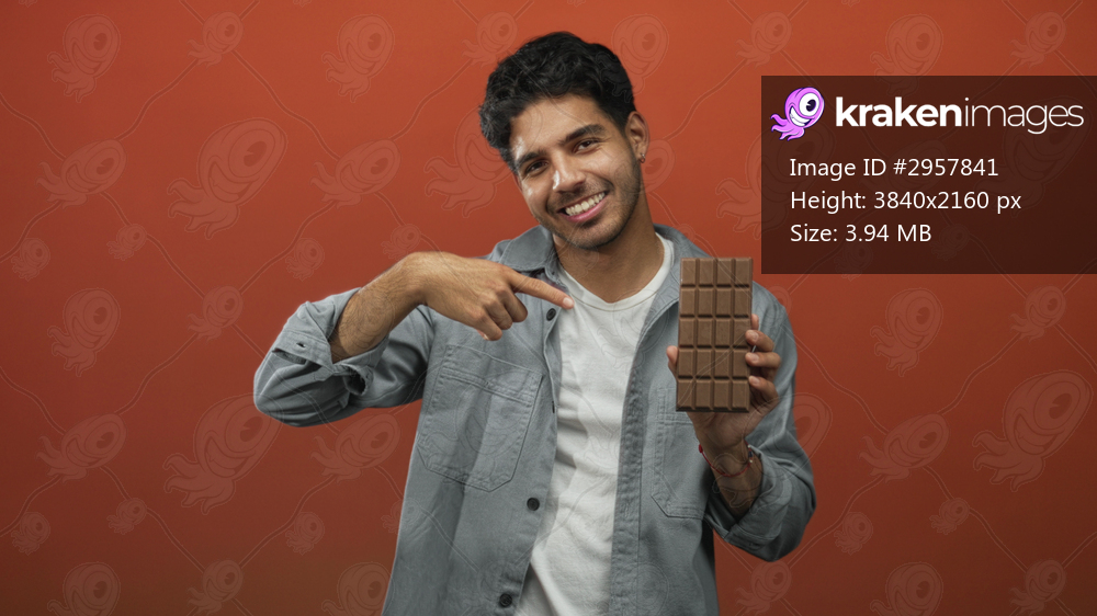 Man smiling points finger at large chocolate bar while holding it with right hand in studio; joy promotion.