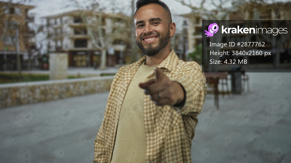 Man smiling and points finger to camera showing exposed hand and face on street plaza near benches and buildings; friendly invitation confidence.
