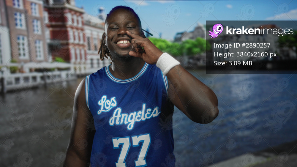 Man smiling and points finger to cheek on an amsterdam street by canal buildings and water; playful happiness.