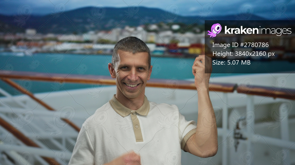 Man smiling and posing playfully as if playing guitar on a cruise ship with a coastal city view in the background, capturing a fun outdoor moment on the sea. - Kraken Images