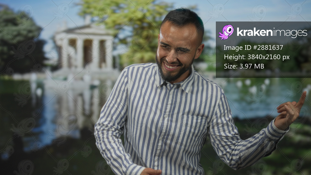 Man smiling with raised finger pointing to building by a park lake, striped shirt visible; joy carefree moment.