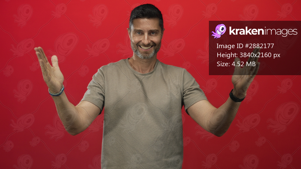 Man smiling with raised hands in red studio, wearing beige t shirt, watch and bracelet, facing camera with open palms and relaxed posture; friendly welcome. - Kraken Images