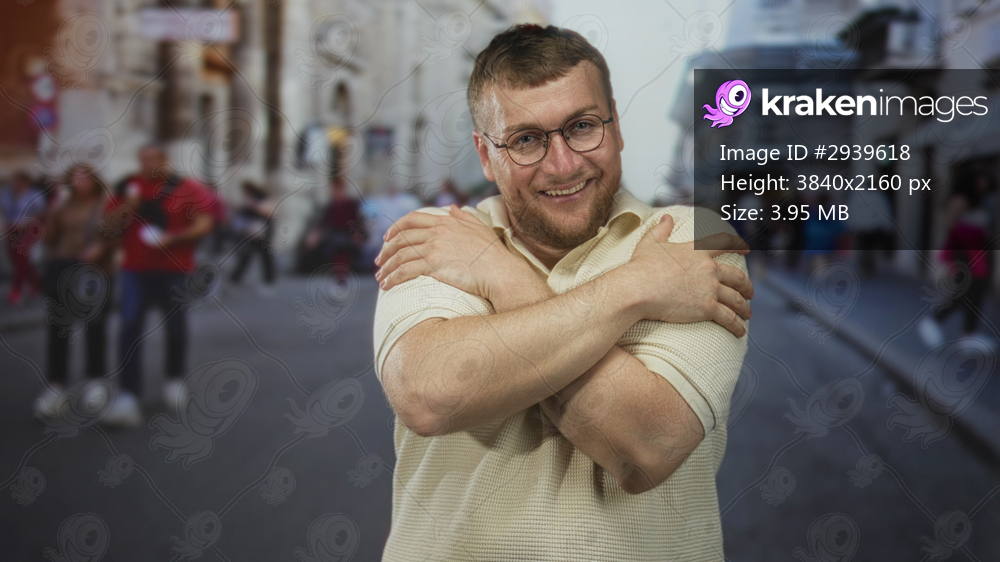 Man smiling and reaching forward then hugging his forearms with crossed arms on a busy city street in daytime; self care joy.