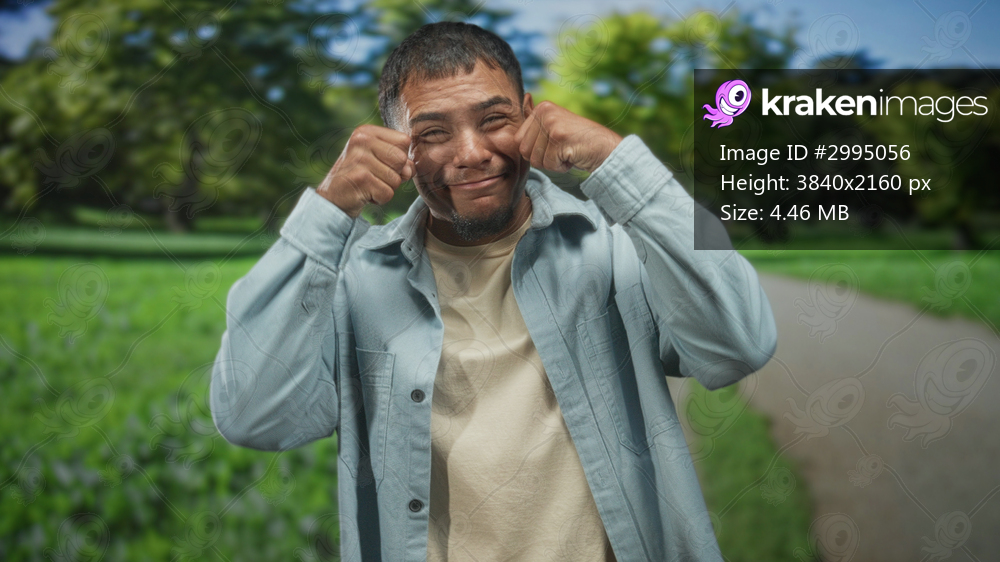 Man smiling and rubbing his eyes while gesturing to camera on a tree-lined park path wearing a light blue shirt; playful.