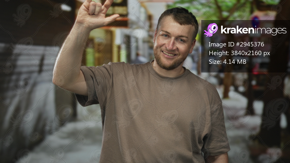 Man smiling and showing i love you hand sign with raised left hand and bare forearm, wearing brown t shirt on a busy city street with storefronts and trees; love greeting friendly. - Kraken Images