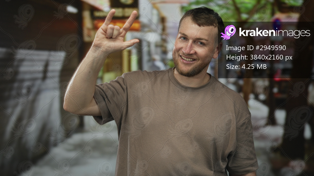 Man smiling and showing i love you hand sign with raised left hand and bare forearm, wearing brown t shirt on a busy city street with storefronts and trees; love greeting friendly. - Kraken Images