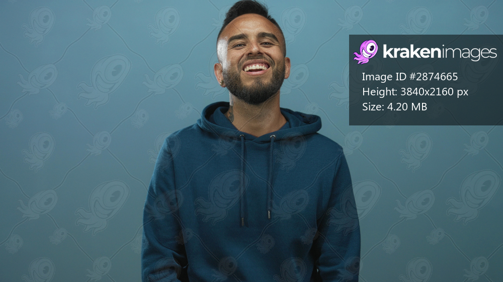 Man smiling showing teeth and beard in teal studio wearing blue hoodie, relaxed pose; joy warmth openness.
