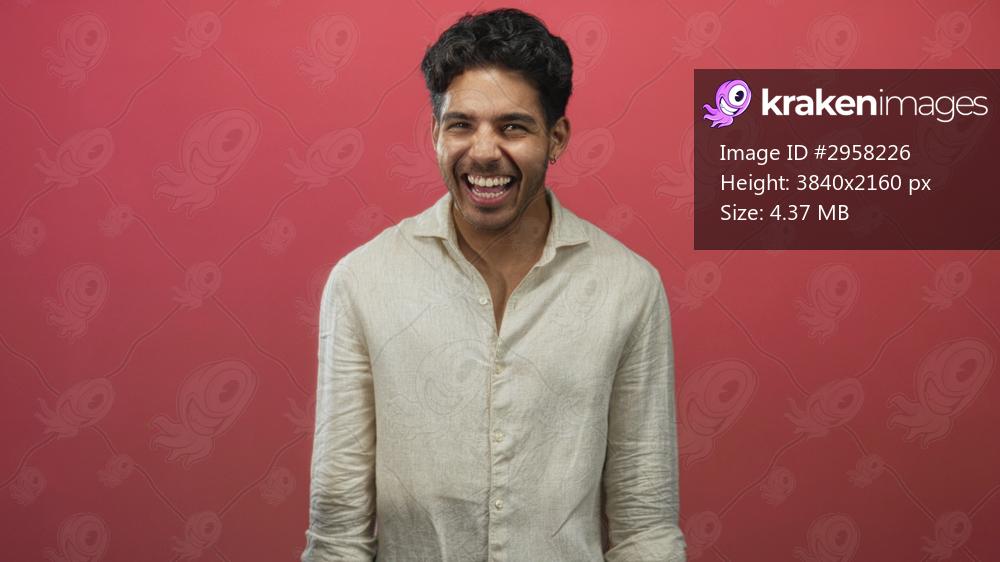 Man smiling showing teeth and laughing with clenched hands wearing linen shirt in studio; joy confidence.