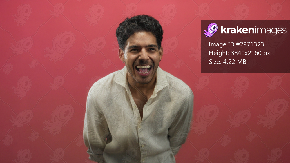 Man smiling showing teeth and laughing with clenched hands wearing linen shirt in studio; joy confidence.