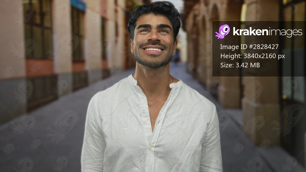 Man smiling showing teeth while looking up on historic sunlit street; optimism curiosity adventure inspiration.