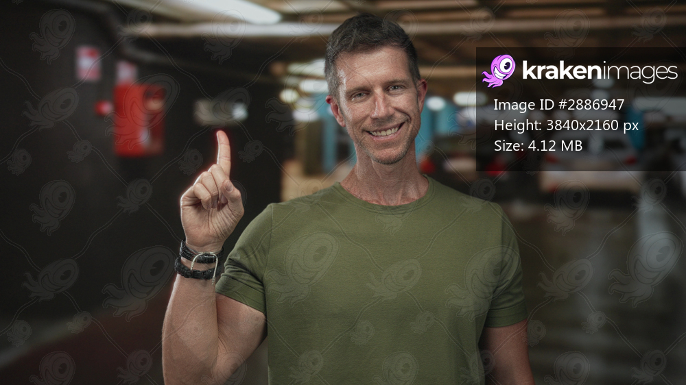 Man smiling and showing two fingers peace sign with exposed hand in parking building; optimism friendship.