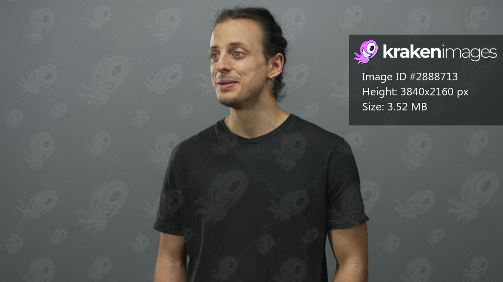 Man smiling and speaking with long hair and small hoop earring, wearing black tshirt in gray studio; friendly confidence.