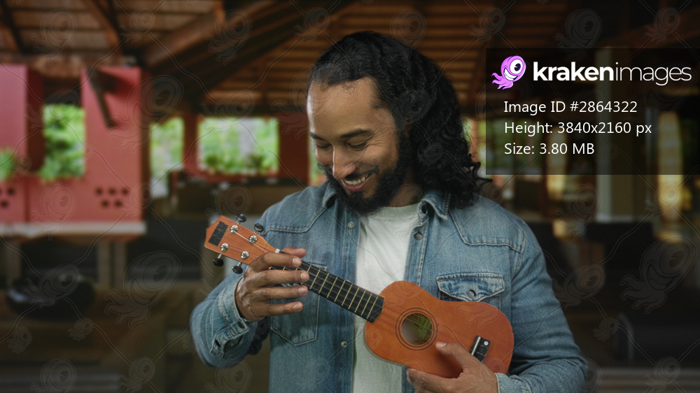 Man smiling and strumming a ukulele with hands on the fretboard, wearing denim jacket and white t shirt inside a hotel building lobby; serenity.