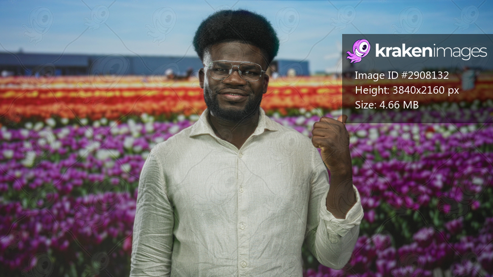 Man smiling with thumbs up beside a colorful tulip field in studio set, wearing cream shirt and glasses, pointing thumb toward flowers; confidence leisure. - Kraken Images