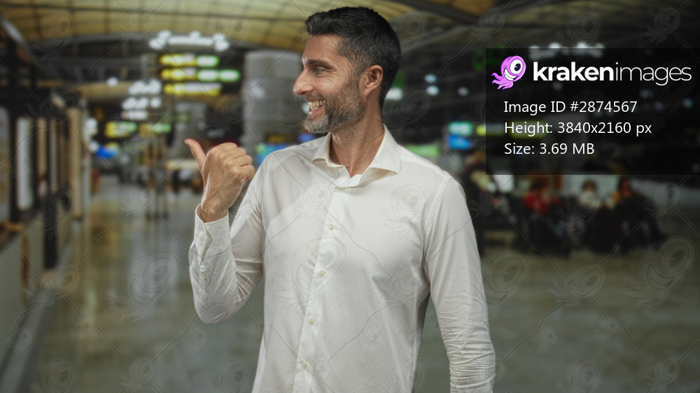 Man smiling with thumbs up pointing left in airport terminal, wearing white shirt and visible beard; confidence travel ease.