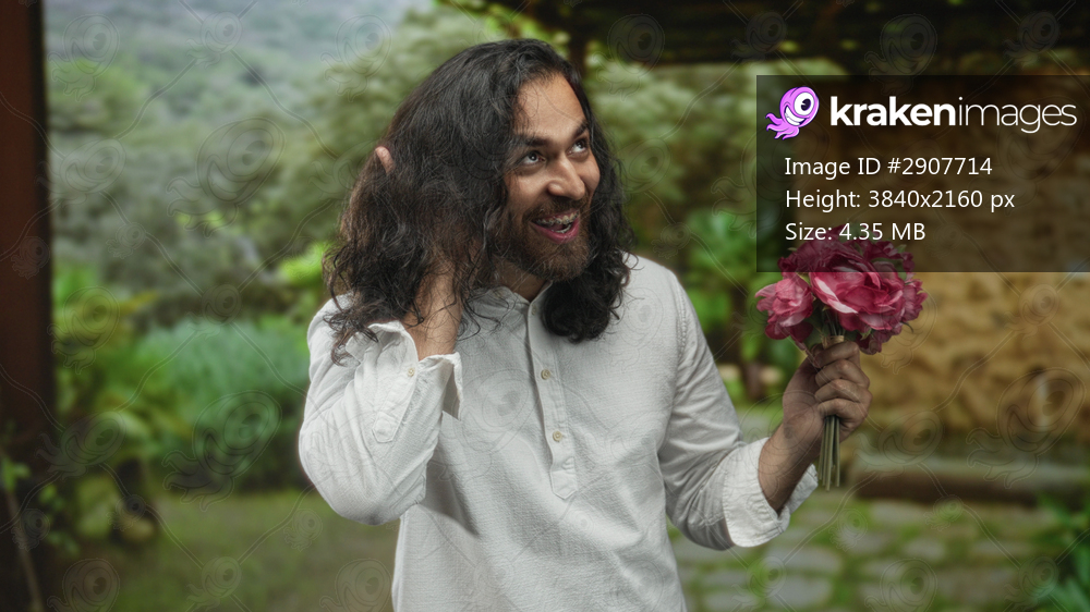 Man smiling and touching hair while holding pink bouquet in building courtyard; playful romance affection.