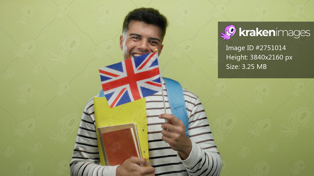 Man smiling with united kingdom flag over yellow background holding books wearing backpack