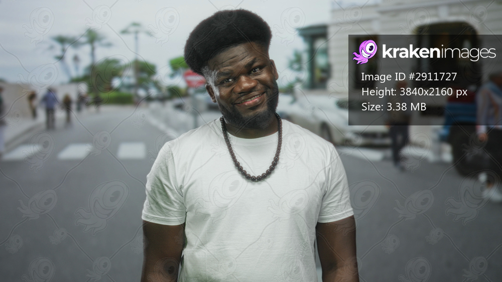 Man smiling with visible face and beaded necklace on a city street crosswalk with blurred pedestrians and cars; confidence charisma ease.