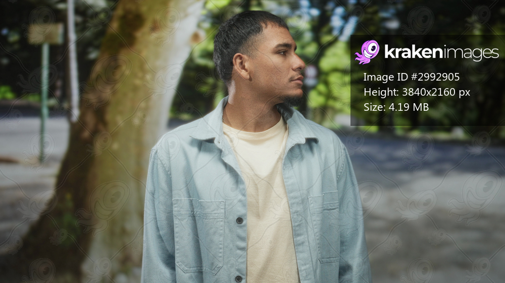 Man smiling with visible face in a light blue denim shirt standing beside a large tree on a street near a red bus and sidewalk; warm optimism.