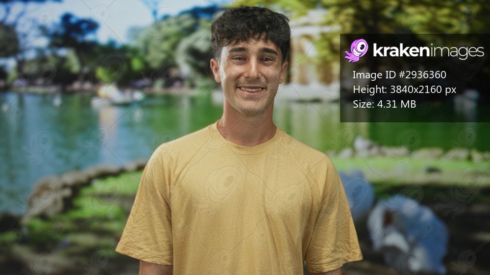 Man smiling with visible face standing in green park near a pond and classical building, wearing yellow t shirt; contentment leisure outdoor.