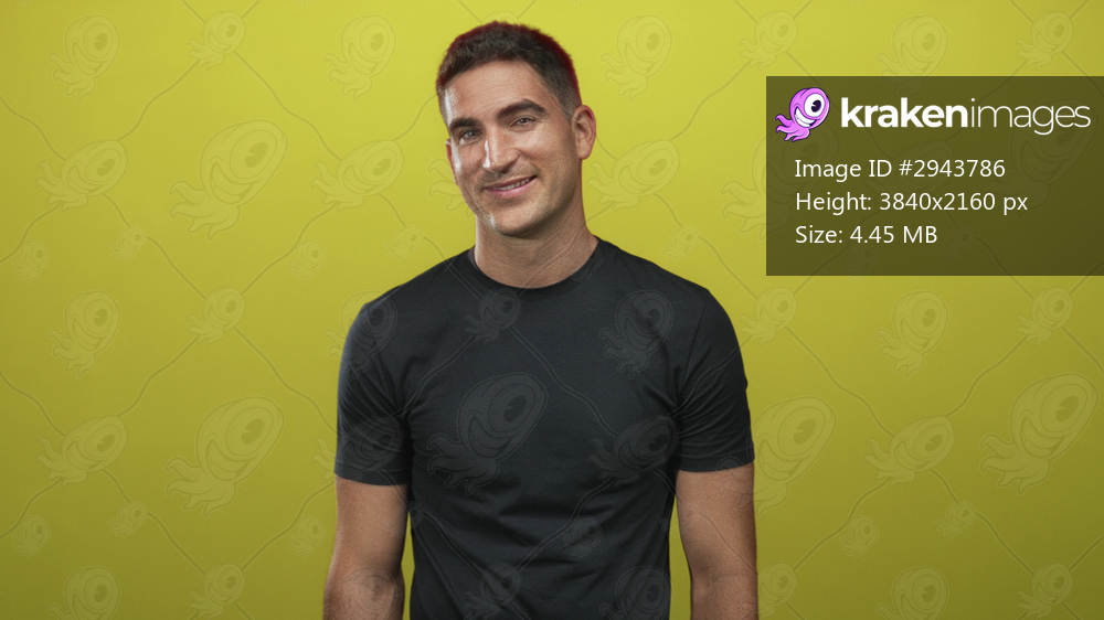Man smiling with visible forearms and slight head tilt wearing black t shirt in studio with yellow backdrop; friendly approachability confidence.