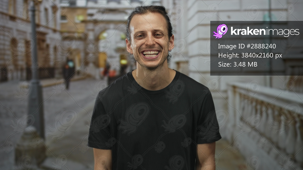 Man smiling with visible teeth and long hair tied back on city street beside stone balustrade and lamppost while wearing black t shirt; joy confidence. - Kraken Images