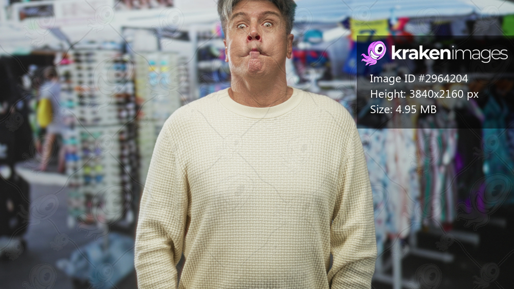 Man smiling with visible teeth wearing a cream sweater amid racks of clothes at a busy street market stall; joyful candid moment.