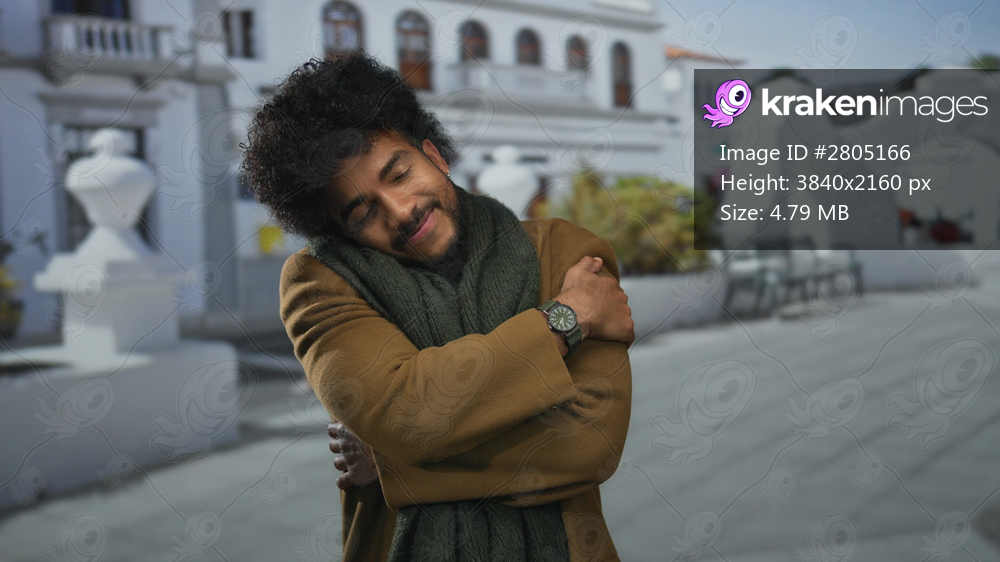 Man smiling warmly on city street wearing brown coat and scarf in outdoor urban setting on sunny day displaying joyful expression with historic architecture in background. - Kraken Images