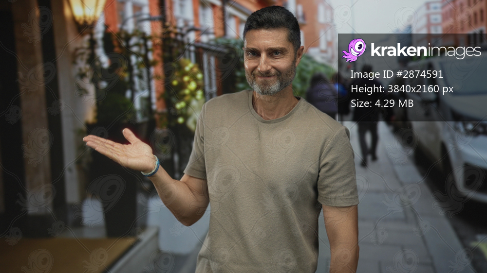 Man smiling and waving hand on a busy city street beside parked cars and pedestrians, casual t shirt visible; friendly greeting.
