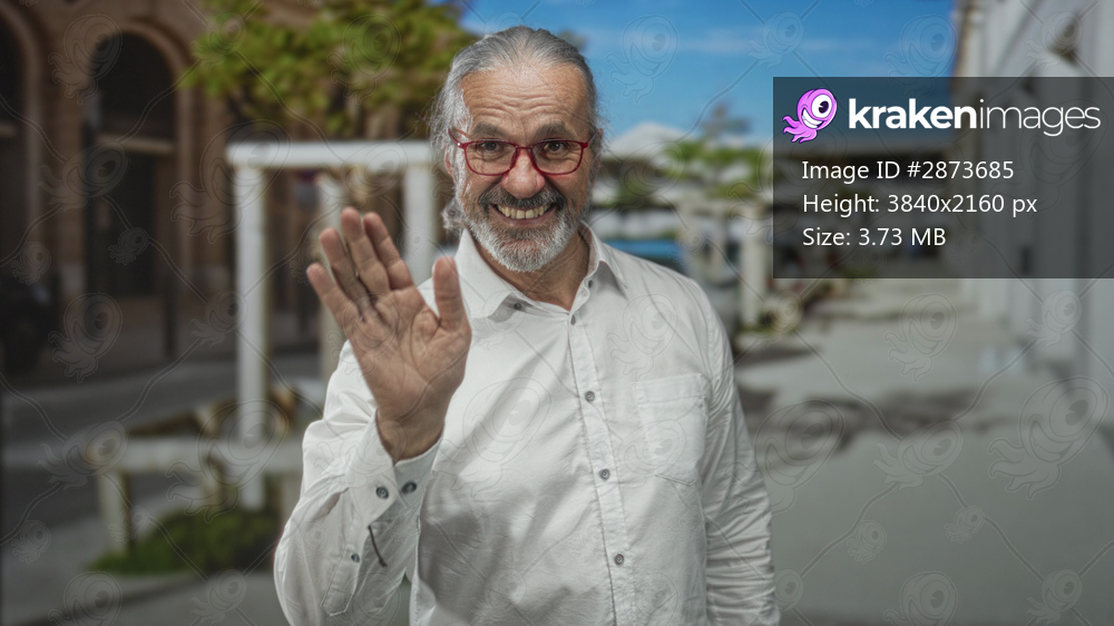Man smiling and waving hand on a street with white shirt and red glasses near planters and buildings; warmth greeting.