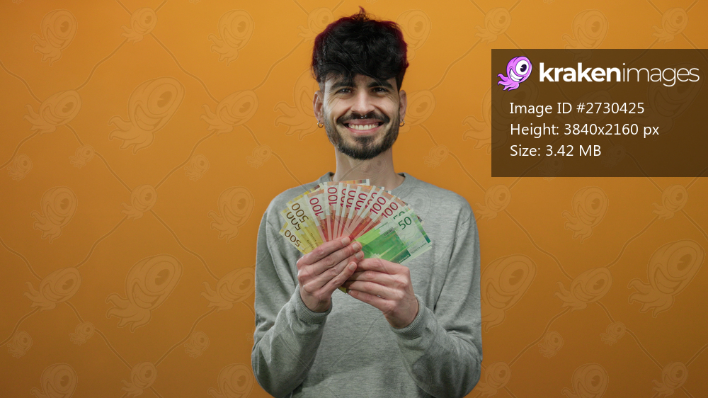 Man smiling while holding norwegian kroner against an isolated orange background, showcasing wealth and happiness.