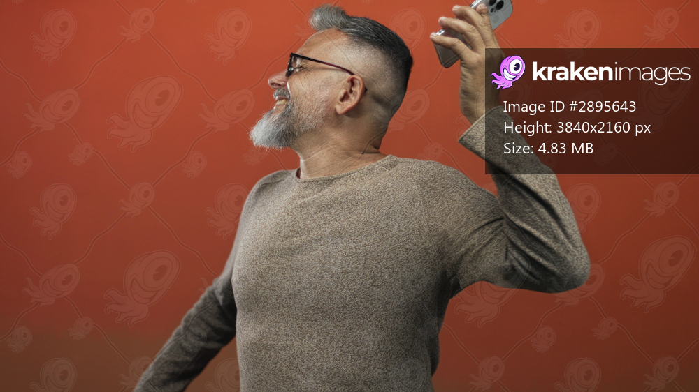 Man smiling while holding smartphone aloft with hand to head in orange studio wearing glasses and gray beard sweater; joy confidence.
