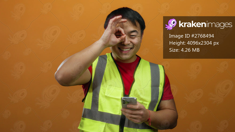 Man smiling while holding smartphone in high-visibility vest against orange background