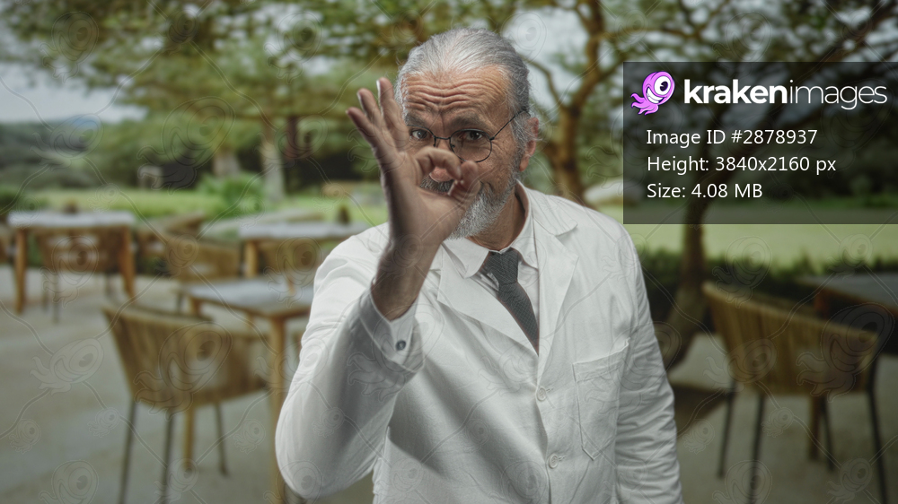 Man smiling while making ok sign with right hand, wearing white lab coat and tie on a restaurant terrace by a building outdoors; confidence assurance.