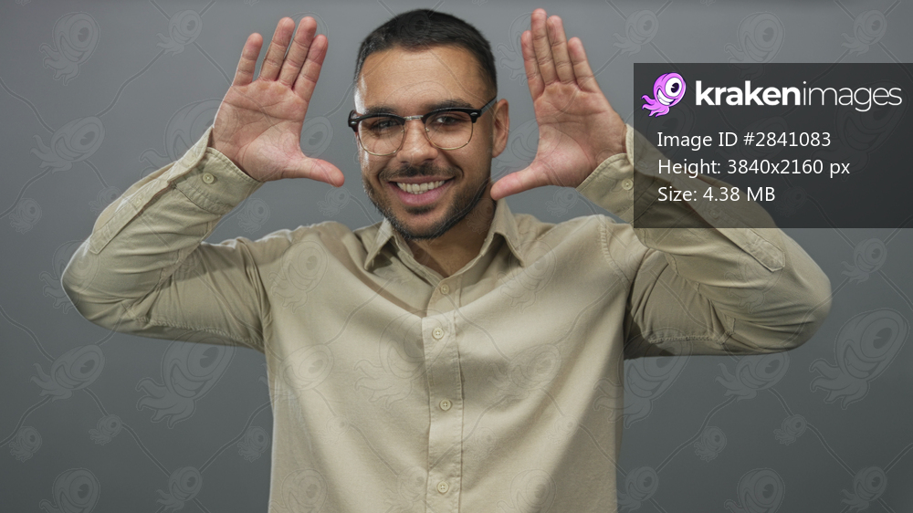 Man smiling with wide grin and forming frame with hands in gray studio; happiness creativity vision focus.