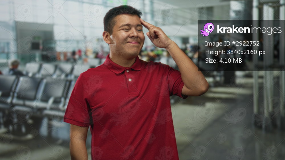 Man snaps fingers with right hand in airport terminal, wearing red polo and smiling; playful optimism.