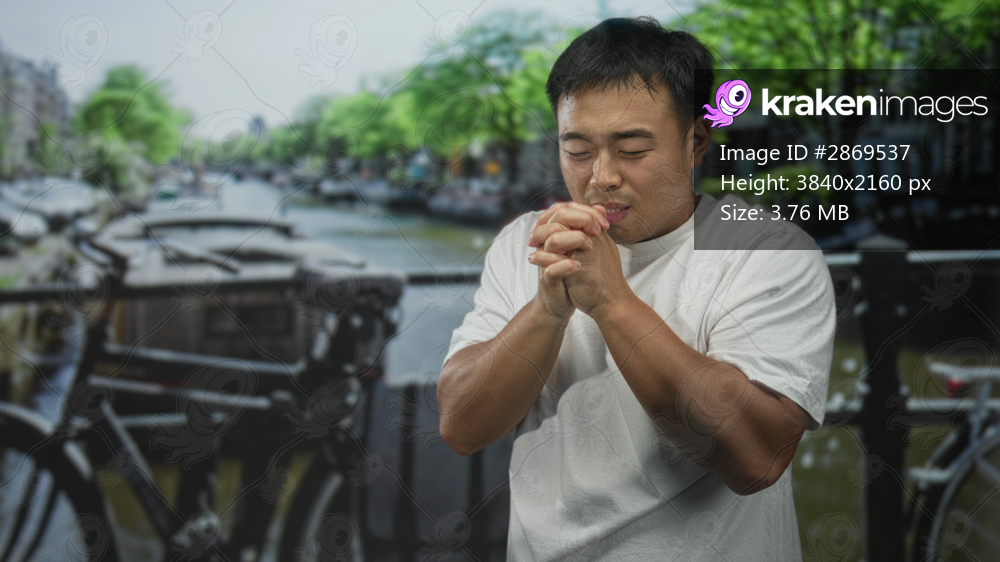Man sneezing into cupped hands on street beside canal lined with bicycles and buildings; allergy discomfort.