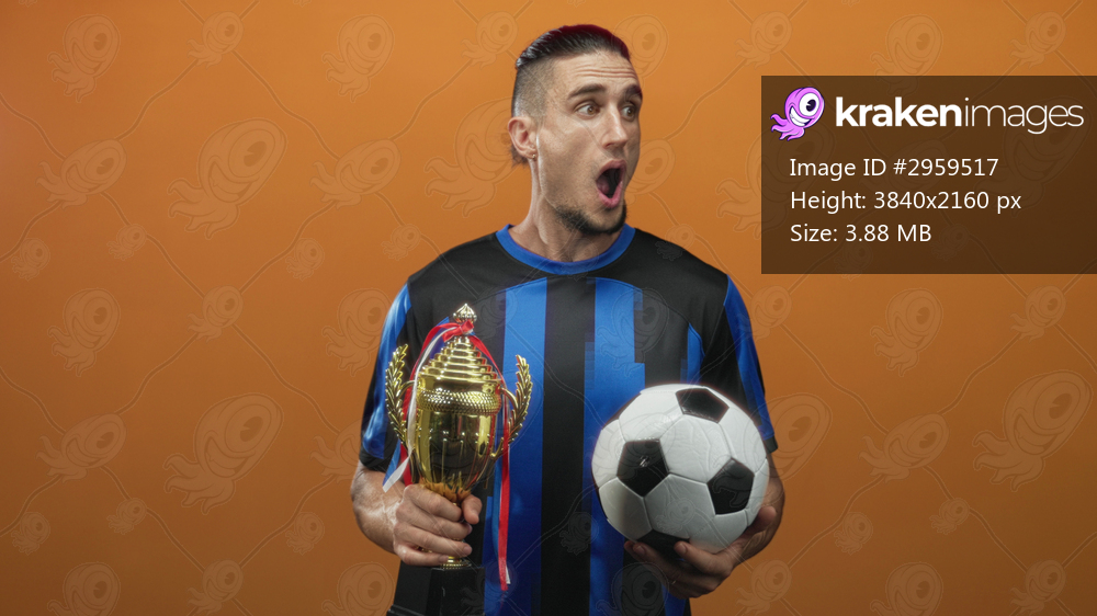 Man soccer player holding gold trophy and black and white soccer ball, mouth open in surprise, wearing blue and black striped jersey, studio; victory celebration. - Kraken Images