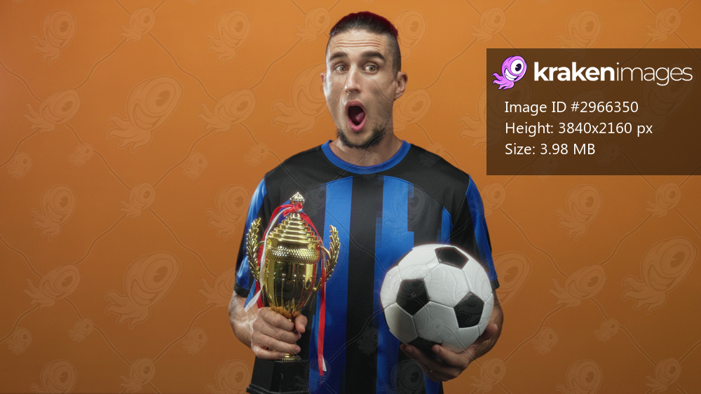 Man soccer player holding gold trophy and black and white soccer ball, mouth open in surprise, wearing blue and black striped jersey, studio; victory celebration. - Kraken Images