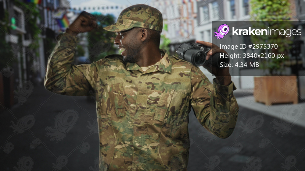 Man soldier holding binoculars, raising fist on a city street while smiling, wearing camouflage uniform and cap; pride duty.