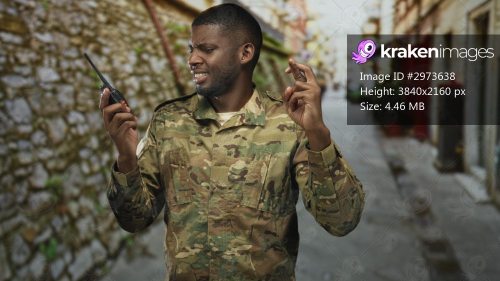 Man soldier in camouflage holding radio with fingers crossed in a narrow stone street; hope duty resilience.