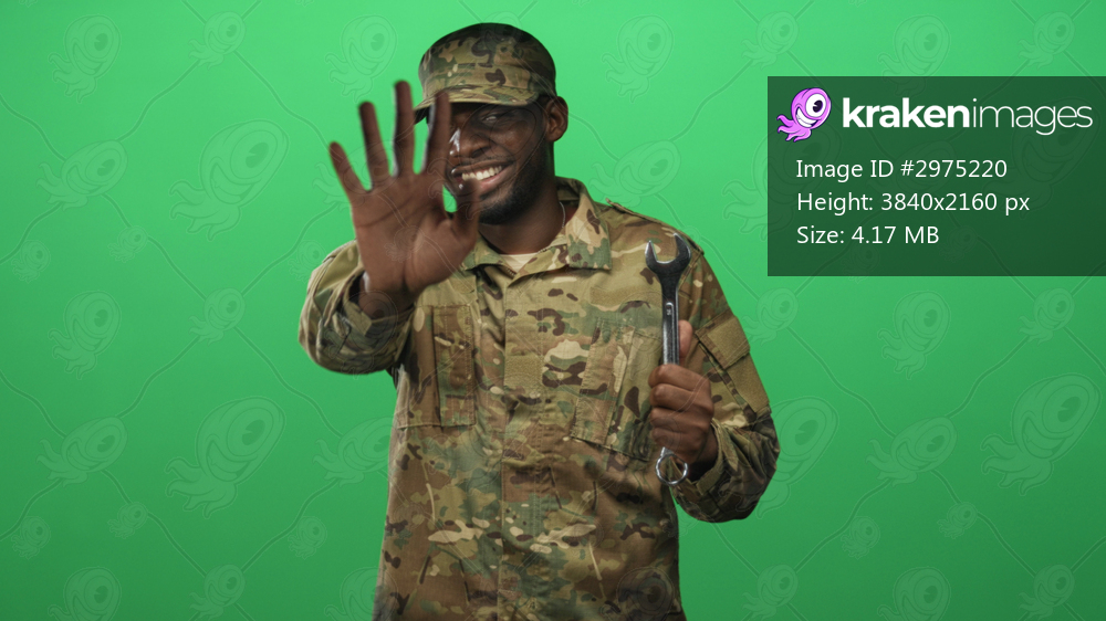 Man soldier in camouflage holding wrench with hand on chest while smiling and waving toward camera in studio; pride duty.