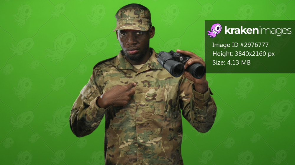 Man soldier in camouflage holds binoculars near face and adjusts cap with hand in studio; alertness duty surveillance.