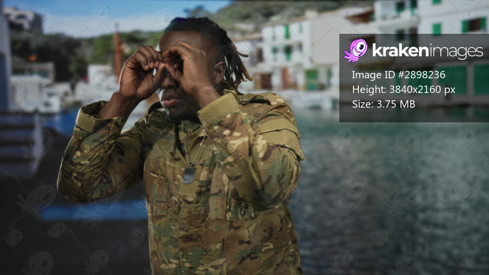Man soldier in camouflage jacket with dog tags forming hand binoculars to eyes in studio by seaside boats, focused posture; vigilance duty readiness.