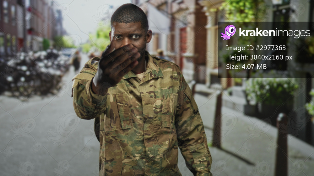 Man soldier in camouflage uniform beckons with hand toward camera, wearing backpack, closeup on a street; pride duty invitation.