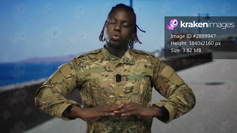 Man soldier in camouflage uniform with dog tags showing open palms on a street promenade by the seaside; duty resilience.