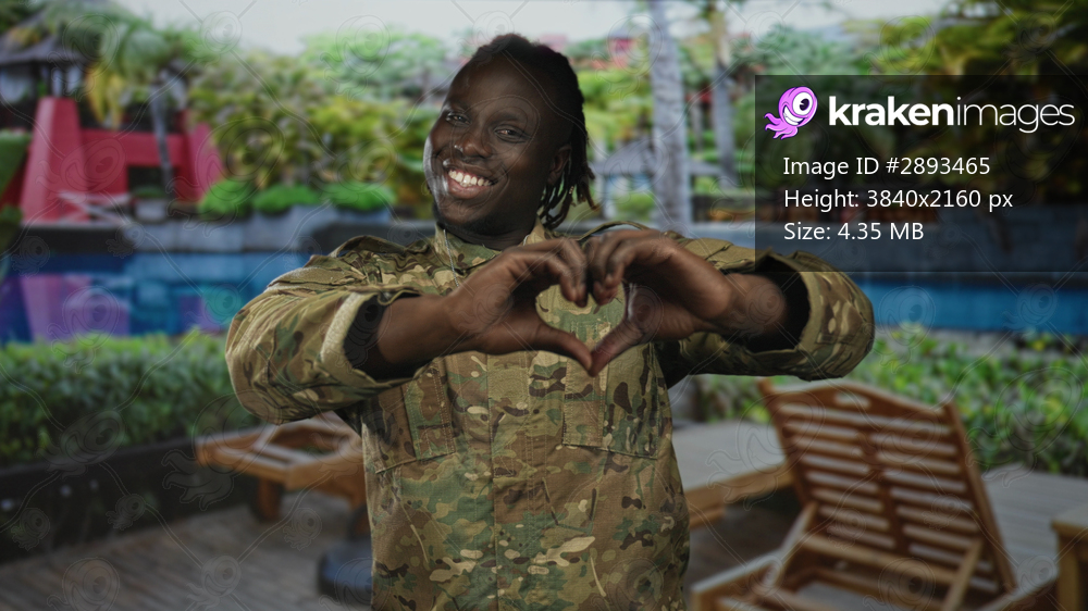 Man soldier in camouflage uniform forms heart with hands at hotel pool while smiling and posing outdoors; joy relaxation.