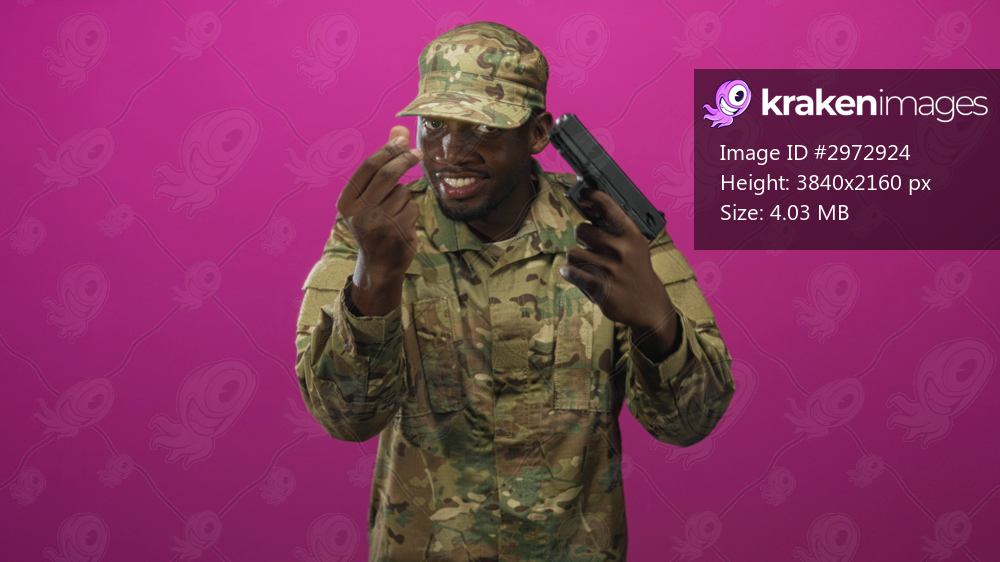 Man soldier in camouflage uniform holding a gun to his head while making a pinching fingers gesture against a magenta studio backdrop, smiling; tension threat. - Kraken Images