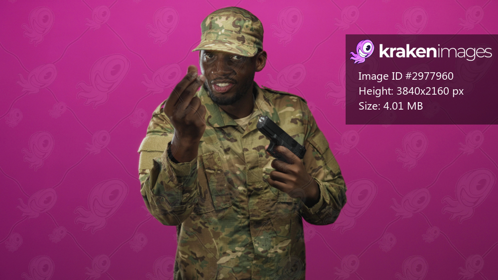 Man soldier in camouflage uniform holding a gun to his head while making a pinching fingers gesture against a magenta studio backdrop, smiling; tension threat. - Kraken Images