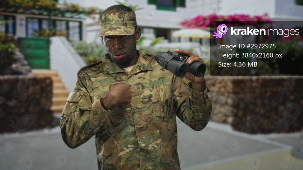 Man soldier in camouflage uniform holding binoculars and pointing finger to chest in front of building courtyard; duty vigilance.